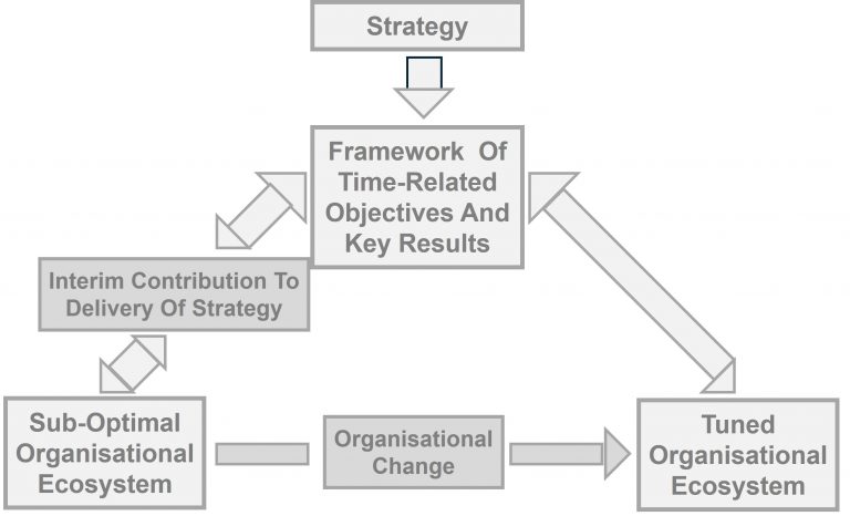At the core of this construct are the strategy, the framework of Objectives and Key Results (OKRs), and the evolving organisational ecosystem. Together, these components illustrate how an organisation transitions from its current, often less-than-ideal state to a more optimised state that is better aligned with its goals.
